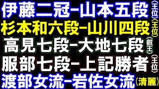 伊藤二冠ー山本五段(王位)、杉本和六段ー山川四段(王位)、高見七段ー佐々木大七段(叡王)、服部七段ー左の勝者(叡王)、渡部女流ー岩佐女流(清麗) アユムの評価値放送