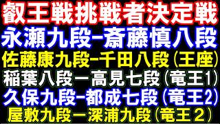 叡王戦挑戦者決定戦 永瀬九段ー斎藤慎八段、竜王戦1組 稲葉八段ー高見七段、2組 久保九段ー都成七段、屋敷九段ー深浦九段、王座予選 佐藤康九段ー千田八段 など